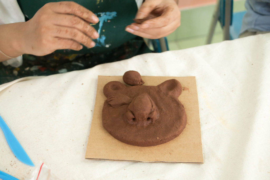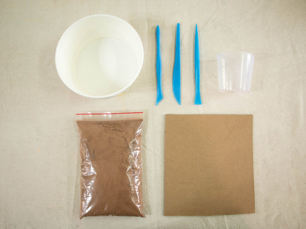 香灰黏土、紙板、雕塑工具、量杯、紙碗、水